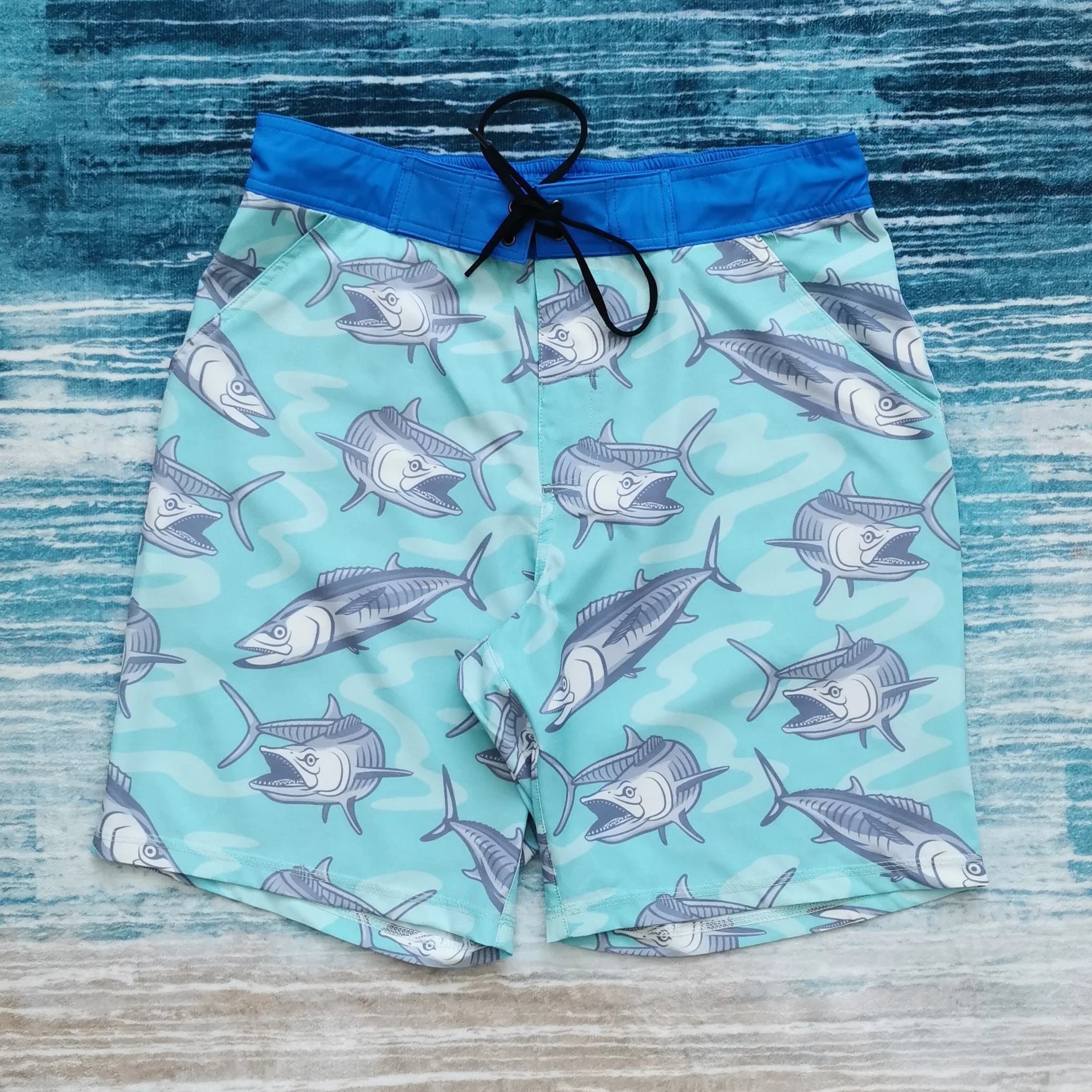 Embark on your fishing adventure with our specially designed model showcasing the Spanish Mackerel, affectionately known as "Kingfish." Tailored for anglers passionate about catching their favorite Kingfish, the medium-sized fish design adorns the shorts, spanning the front and back. Our logo graces the back pocket, adding a touch of authenticity.