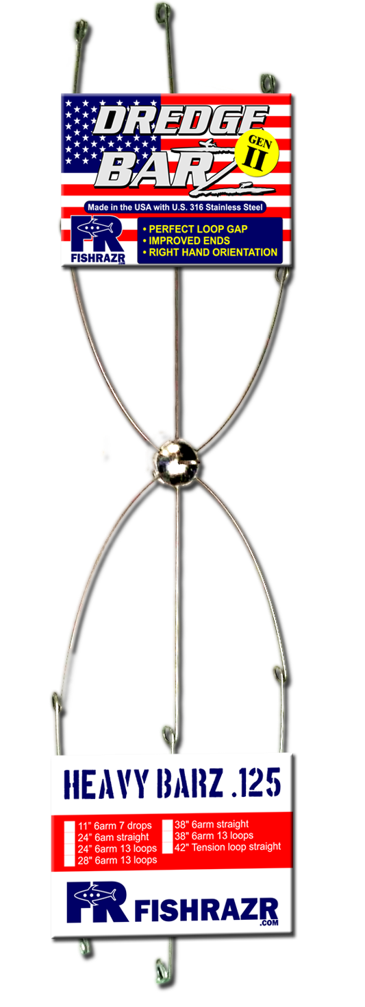 The generation II dredge bar by Fish Razr is the go-to tournament series dredge bar. The 6 arm bars are available 38” lengths. The generation II bars feature improved arm loops with increased gap between the loops and arms for easier swivel application. The arms also are now right-hand orientation and have improved downward ends that still allow room to stage a swivel for application. All Fish Razr dredge bars are made of US 316 stainless steel, .125” diameter, precession bends, and super strong metal allow center hubs. This super strong bar will give you plenty of fishing time