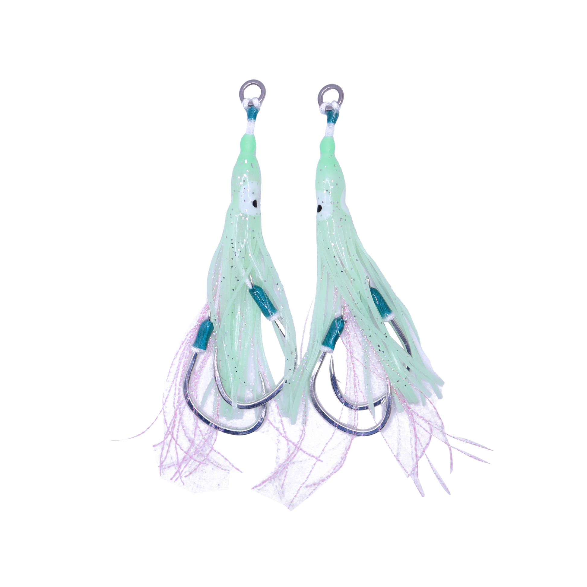 Professionally tied with “Fluorocore Cord” using ultra sharp spade styled slow jigging hooks. Our sleek design allows for minimum water resistance while maximising jig action. We use 2 toned high quality UV tinsel to increase bite rates. Our sizes caters for offshore and shore jigging applications including micro, slow pitch and deep drop jigging. Can be attached at the top of jigs and also run as a rear stinger.